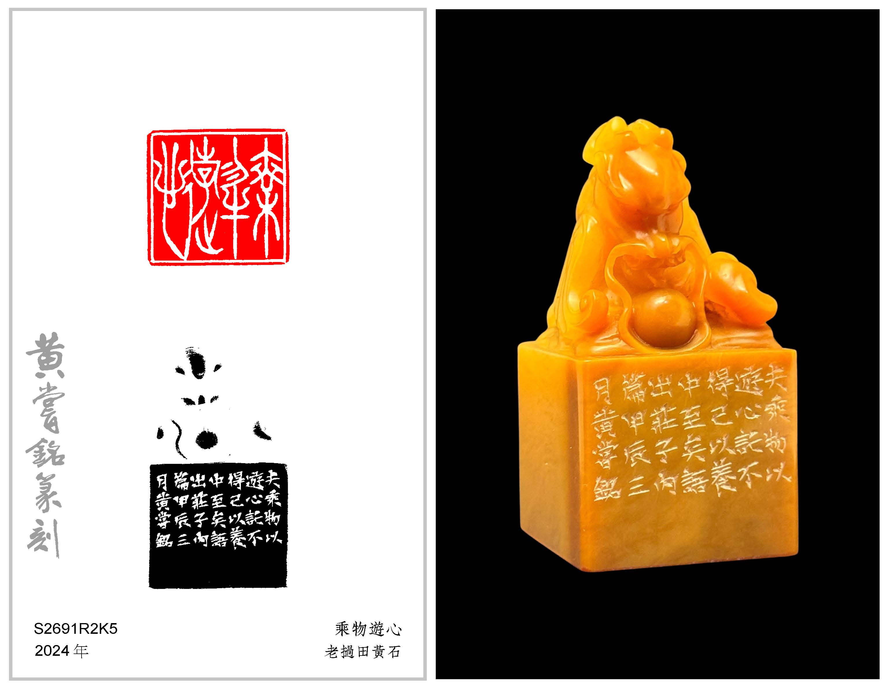 黃嘗銘.七十一歲/刻〔乘物遊心〕正方加框白文印。邊款為【夫乘物以遊心,託不得已以養中,至矣。語出《莊子·內篇》。甲辰三月,黃嘗銘。】老撾田黃石。鰲龍鈕。