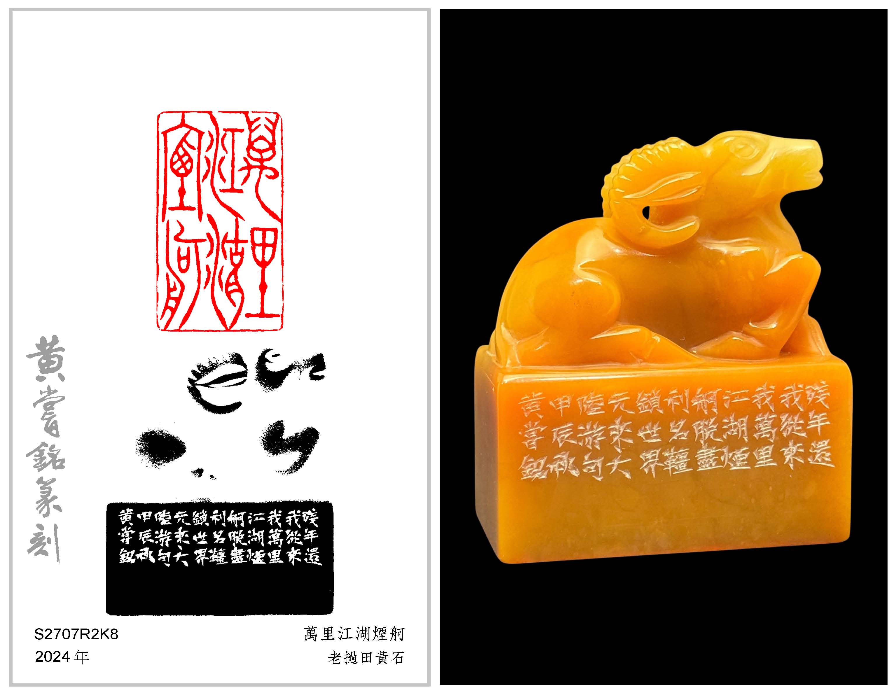 黃嘗銘.七十一歲/刻〔萬里江湖煙舸〕長方朱文印。邊款為【殘年還我從來我,萬里江湖煙舸。脫盡利名韁鎖。世界元來大。陸游句。甲辰秋,黃嘗銘。】老撾田黃石。伏羊鈕。