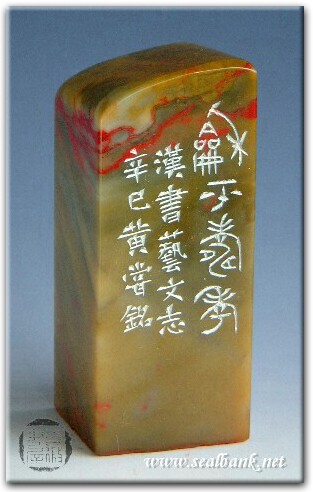 黃嘗銘.四十八歲/刻〔和平壽考〕正方朱文借邊印。邊款為【和平壽考。漢書藝文志。辛巳,黃嘗銘。】昌化雞血石。