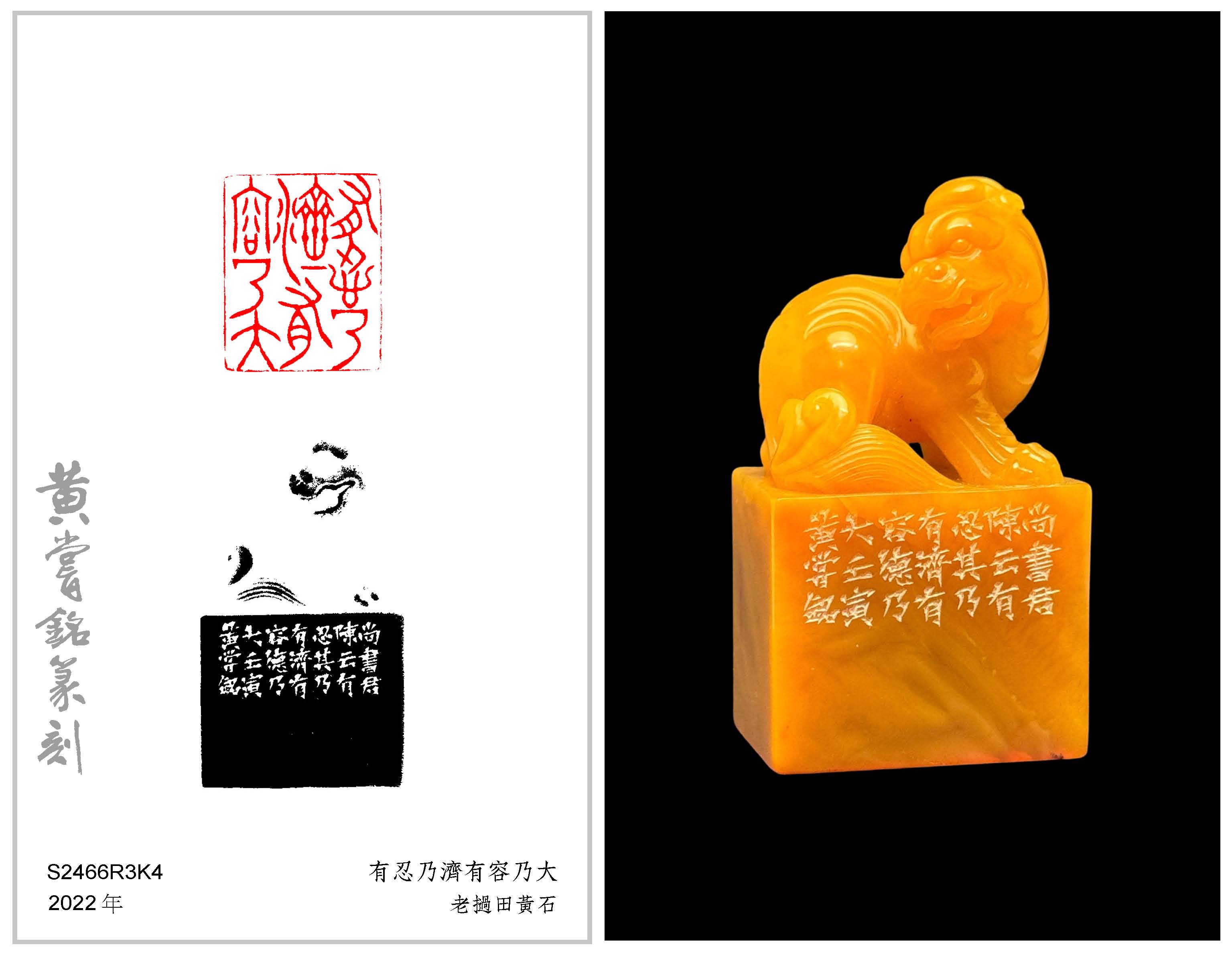 黃嘗銘.六十九歲/刻〔有忍乃濟有容乃大〕長方朱文印。邊款為【《尚書·君陳》云:「有忍,其乃有濟;有容德乃大。」壬寅,黃嘗銘。】老撾田黃石。古獸鈕。