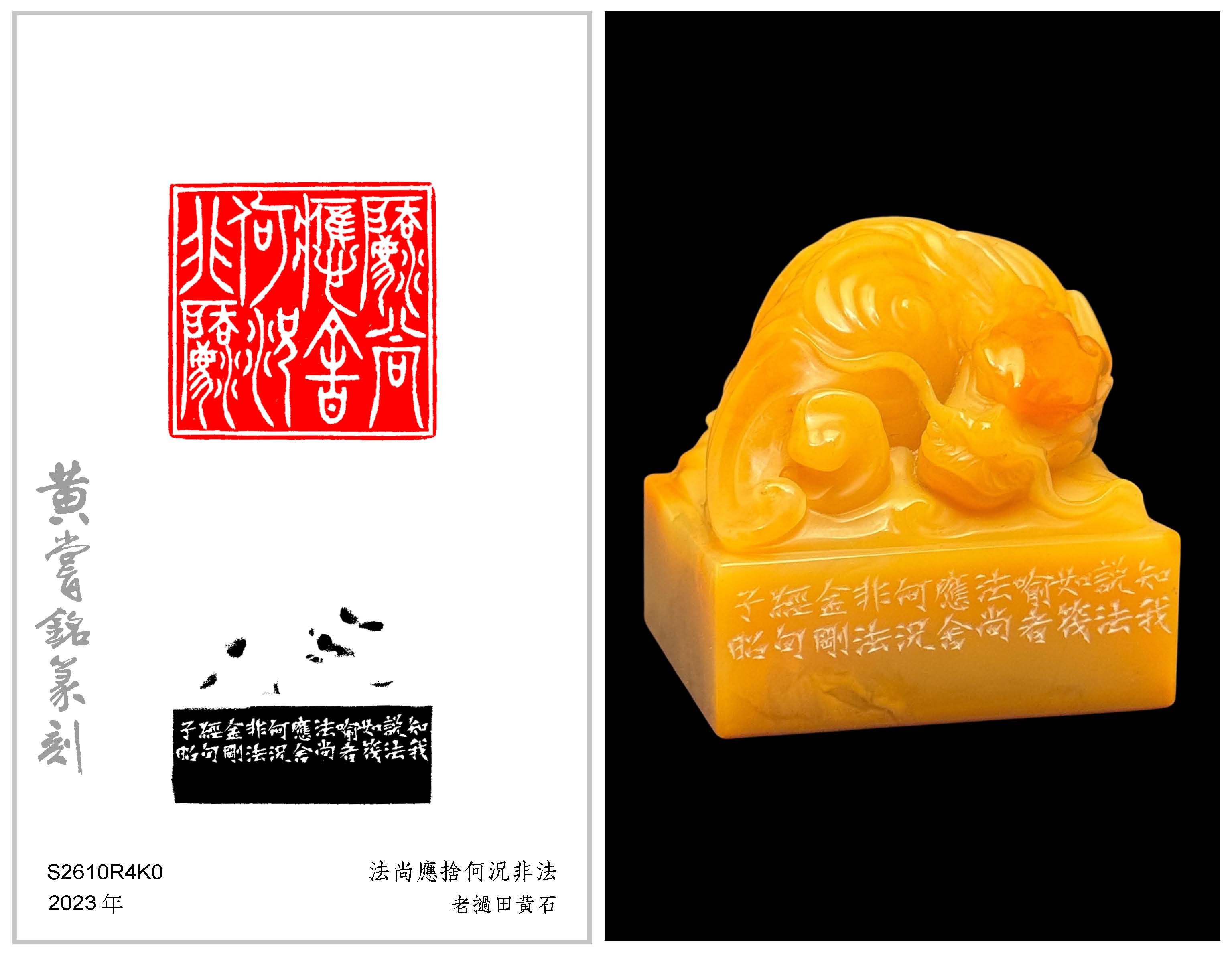 黃嘗銘.七十歲/刻〔法尚應捨何況非法〕正方加框白文印。邊款為【知我說法,如筏喻者,法尚應捨,何況非法。《金剛經》句。子昭。】老撾田黃石。鰲龍鈕。