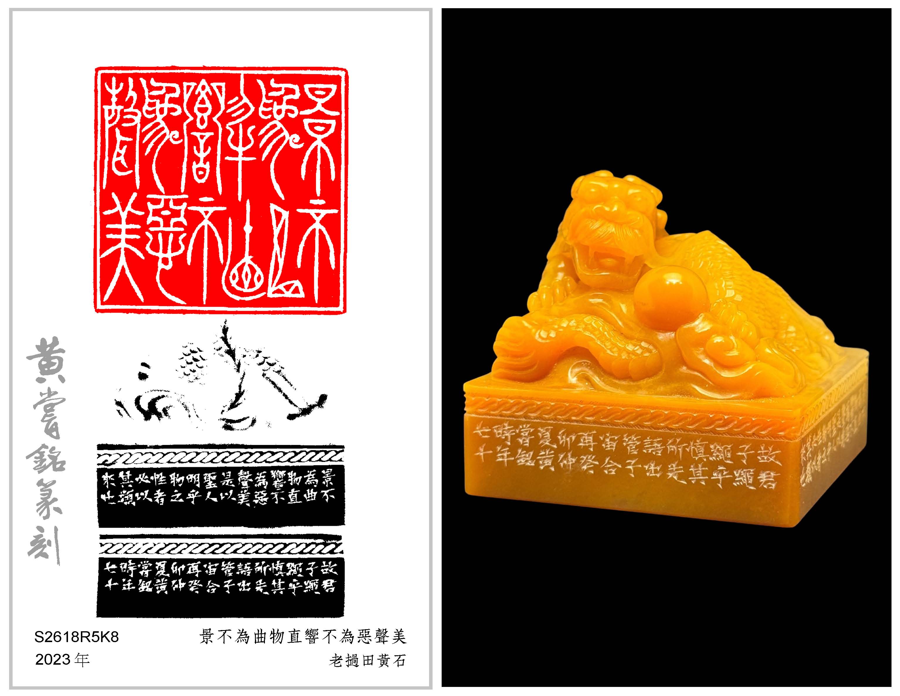 黃嘗銘.七十歲/刻〔景不為曲物直響不為惡聲美〕正方加框白文印。邊款為【景不為曲物直,響不為惡聲美。是以聖人明乎物之性者必以其類來也,故君子繩繩乎慎其所先。語出《管子·宙合》。再癸卯仲夏,黃嘗銘時年七十。】老撾田黃石。龍珠鈕。  2023 年刻
