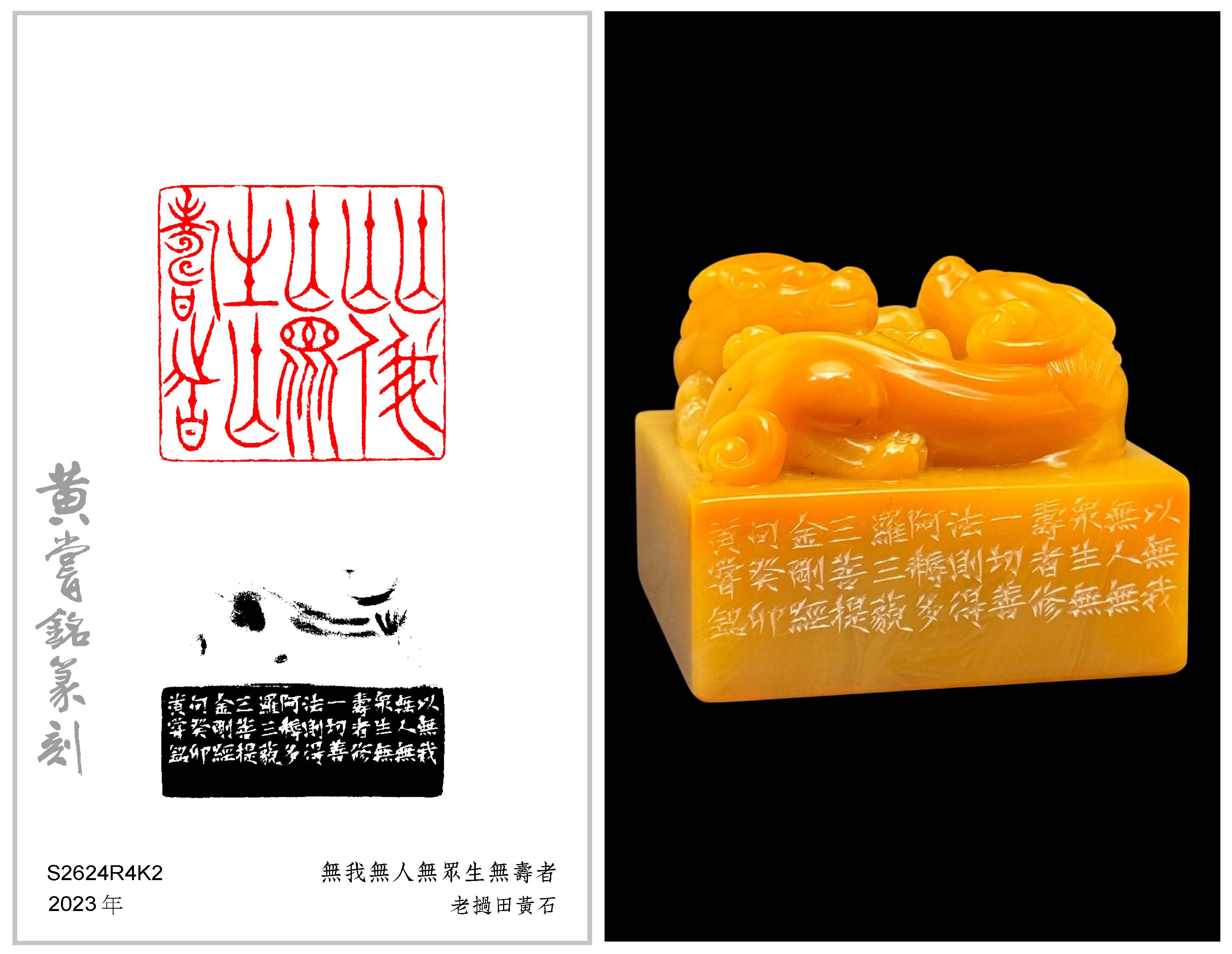 黃嘗銘.七十歲/刻〔無我無人無眾生無壽者〕正方朱文印。邊款為【以無我、無人、無眾生、無壽者,修一切善法,則得阿耨多羅三藐三菩提。《金剛經》句。癸卯,黃嘗銘。】老撾田黃石。雙螭鈕。