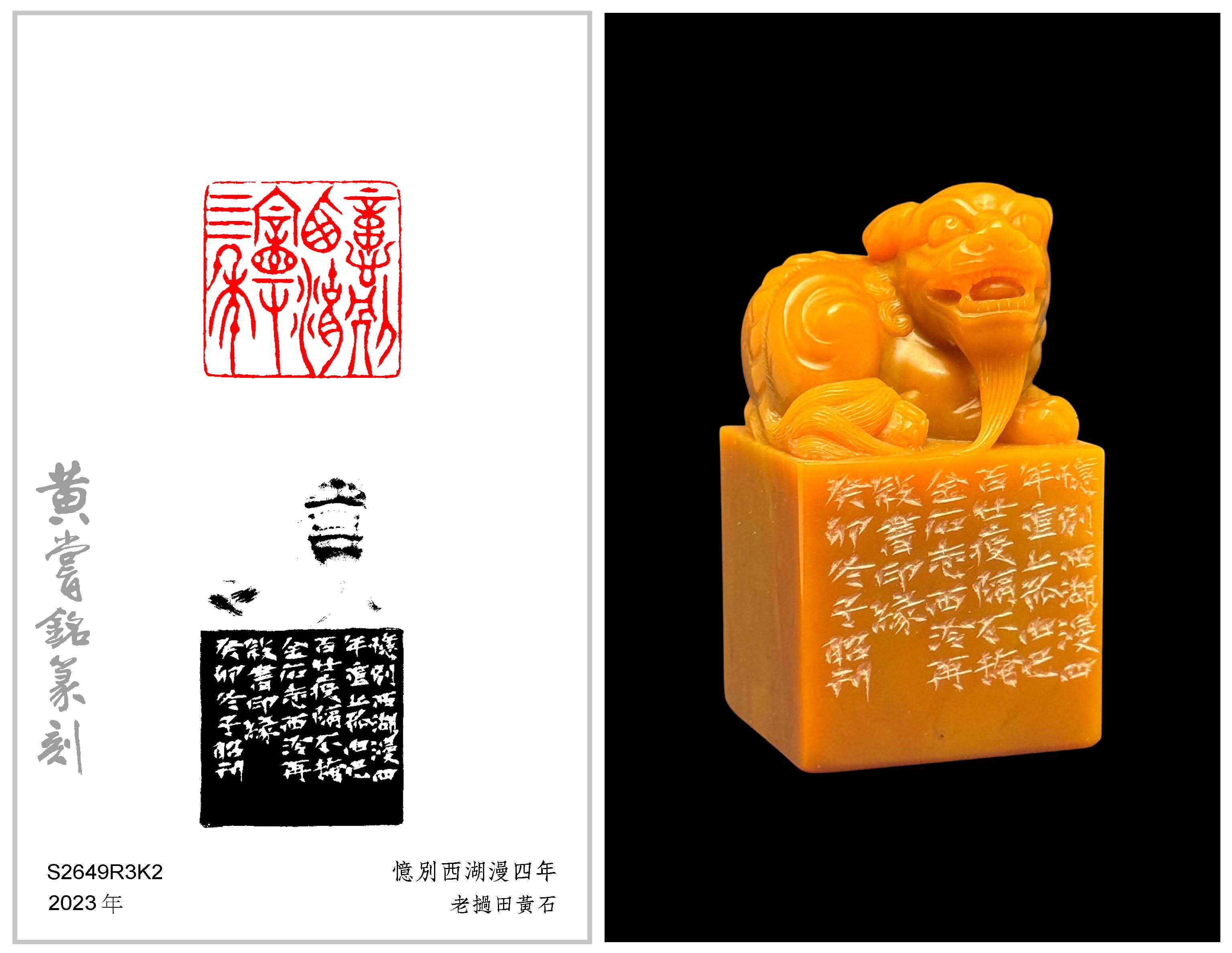 黃嘗銘.七十歲/刻〔憶別西湖漫四年〕正方朱文印。邊款為【憶別西湖漫四年,重上孤山已百廿。疫隔不掩金石志,西泠再敘書印緣。癸卯冬,子昭刻。】老撾田黃石。古獸鈕。