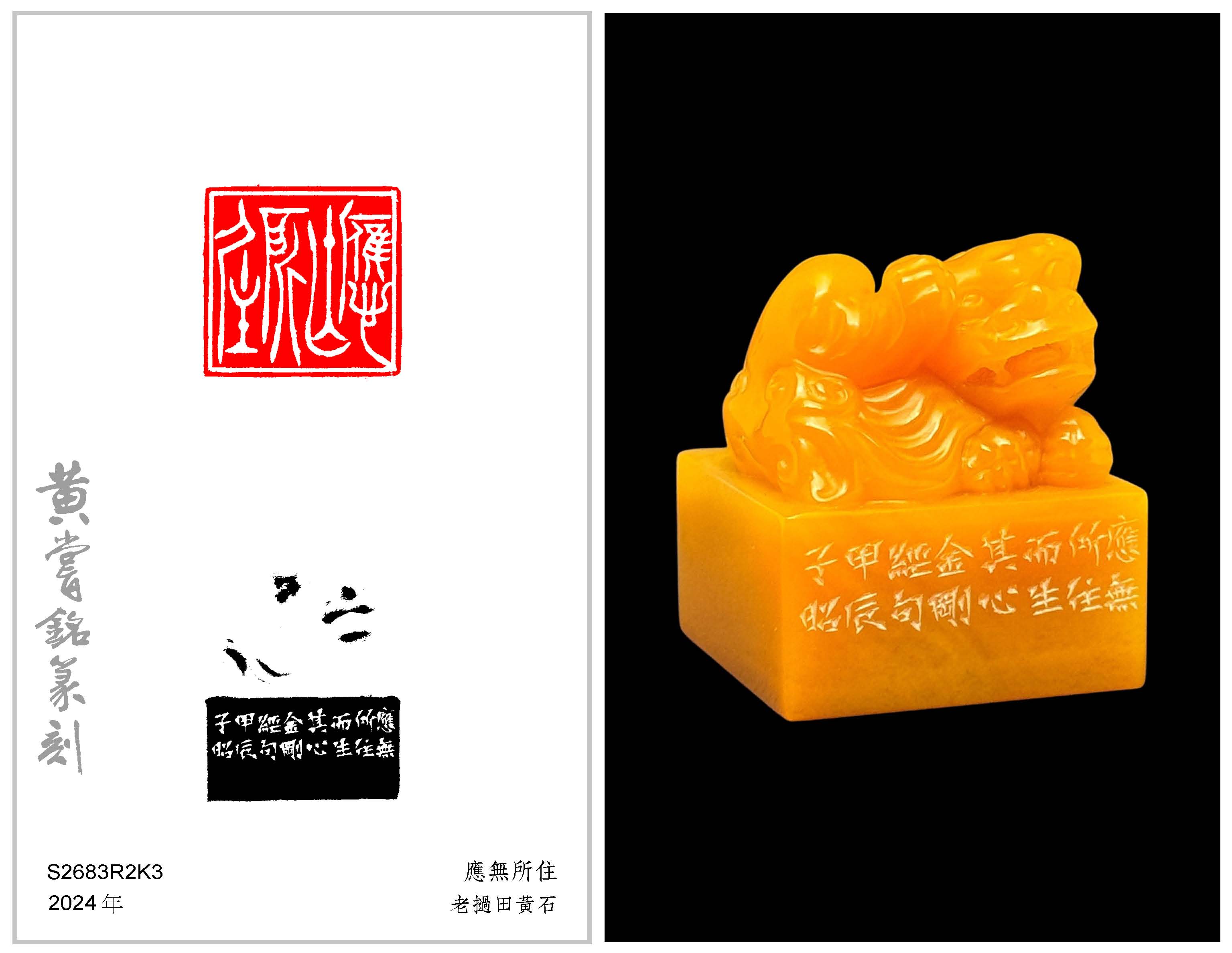 黃嘗銘.七十一歲/刻〔應無所住〕正方加框白文印。邊款為【應無所住而生其心。金剛經句。甲辰,子昭。】老撾田黃石。山水薄意。