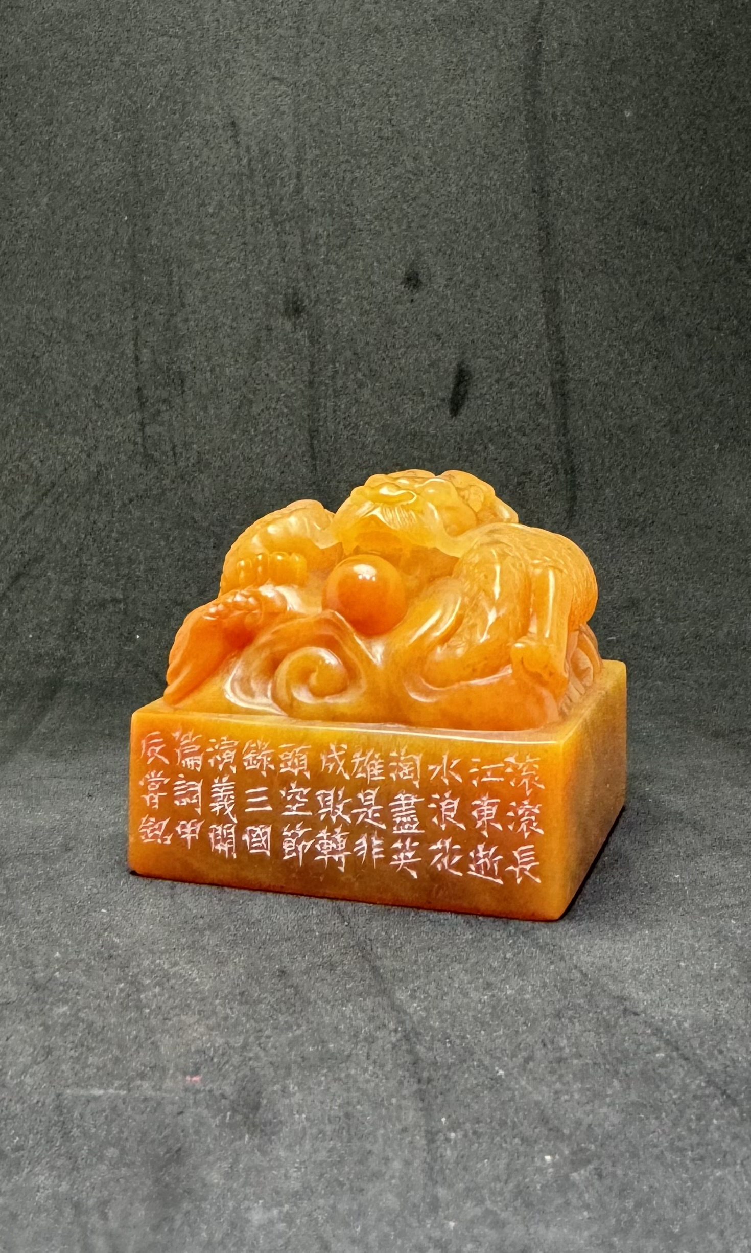 黃嘗銘.七十一歲/刻〔滾滾長江東逝水〕正方加框白文印。邊款為【滾滾長江東逝水,浪花淘盡英雄。是非成敗轉頭空。節錄《三國演義》開篇詞。甲辰,嘗銘。】老撾田黃石。龍珠鈕。