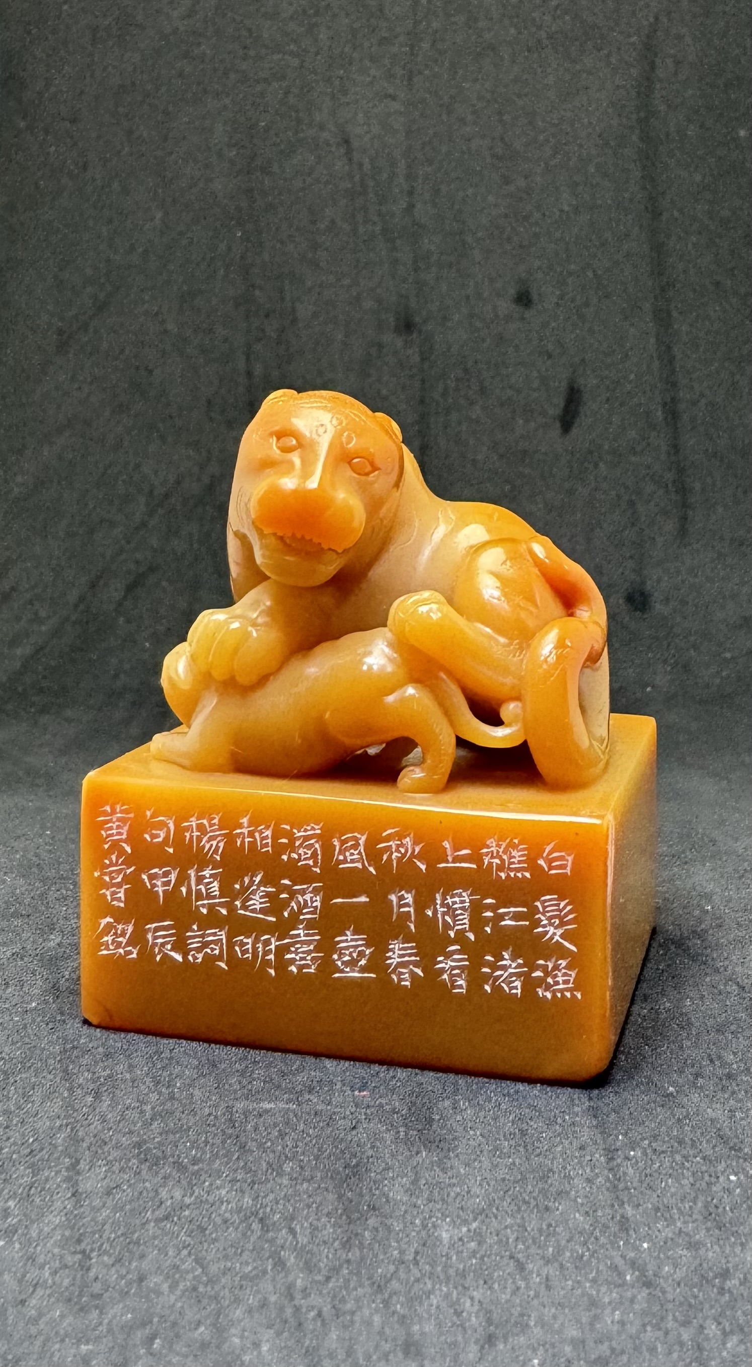 黃嘗銘.七十一歲/刻〔白髮漁樵江渚上〕長方朱文印。邊款為【白髮漁樵江渚上,慣看秋月春風。一壺濁酒喜相逢。古今多少事,都付笑談中。明楊慎詞句。甲辰,黃嘗銘。】老撾田黃石。母子虎鈕。