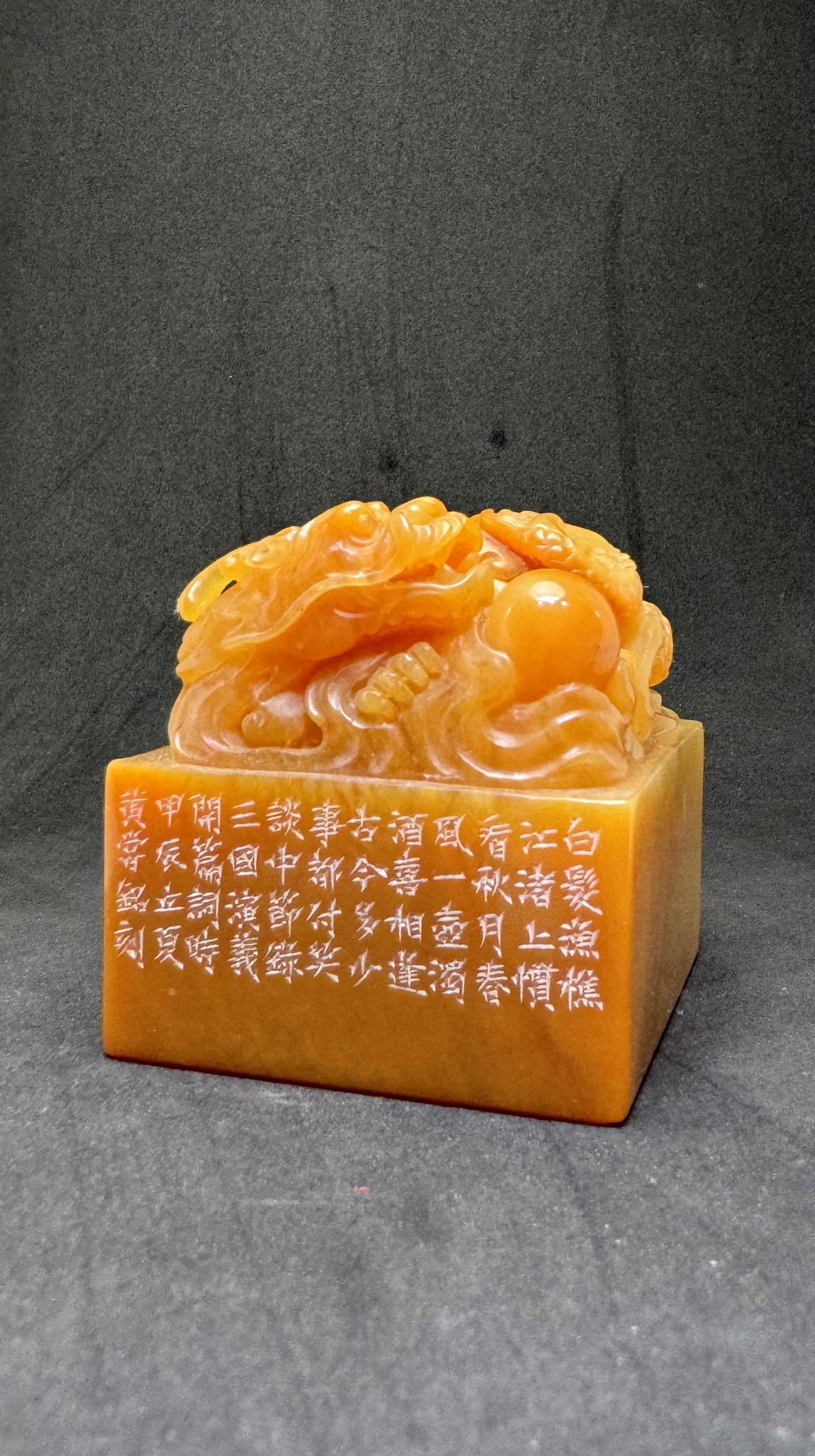 黃嘗銘.七十一歲/刻〔古今多少事都付笑談中〕正方加框白文印。邊款為【白髮漁樵江渚上,慣看秋月春風。一壺濁酒喜相逢。古今多少事,都付笑談中。節錄《三國演義》開篇詞。時甲辰立夏,黃嘗銘刻。】老撾田黃石。龍珠鈕。  2024 年刻