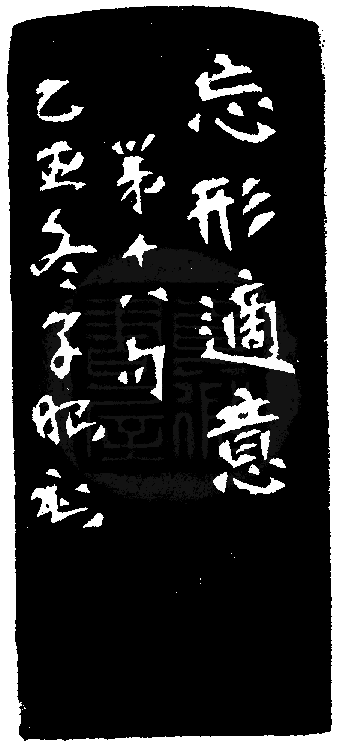 黃嘗銘.卅二歲/刻〔忘形適意〕二連珠朱文界格印。邊款為【忘形適意。第十八句。乙丑冬,子昭刻。】原印今藏於林居正。泰來玳瑁。