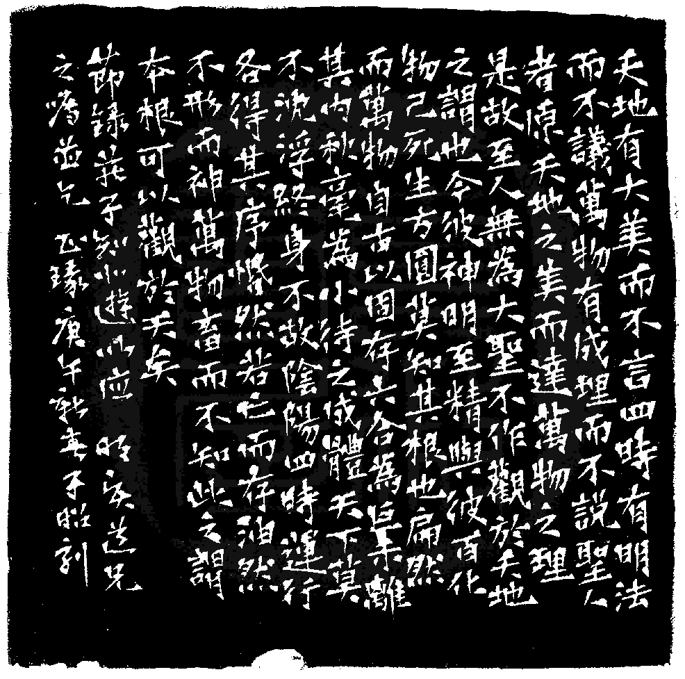 | | 印文:天地有大美而不言 | | 約 橫 8.1 X 豎 8.0 公分 邊款圖 | | 黃嘗銘.卅七歲/刻〔天地有大美而不言〕正方滿白文印。邊款為【天地有大美而不言,四時有明法而不議,萬物有成理而不說,聖人者原天地之美而達萬物之理,是故至人無為,大聖不作,觀於天地之謂也。今彼神明至精,與彼百化物己,死生方圓莫知其根也。扁然而萬物自古以固存,六合為巨,未離其內,秋亳為小,待之成體,天下莫不沈浮終身不故,陰陽四時,運行各得其序,□然若亡而存,油然不形而神,萬物畜而不知,此之謂本根,可以觀於天矣。節錄莊子知北遊,以應明賢道兄之囑,並乞正篆。庚午新春,子昭刻。】原印今藏於江明賢。巴林石。 1990 年刻 |