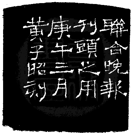 黃嘗銘.卅七歲/刻〔當代〕正方加框白文印。邊款為【聯合晚報刊頭之用,庚午三月,黃子昭刻。】原印今藏於聯合晚報。巴林石。
