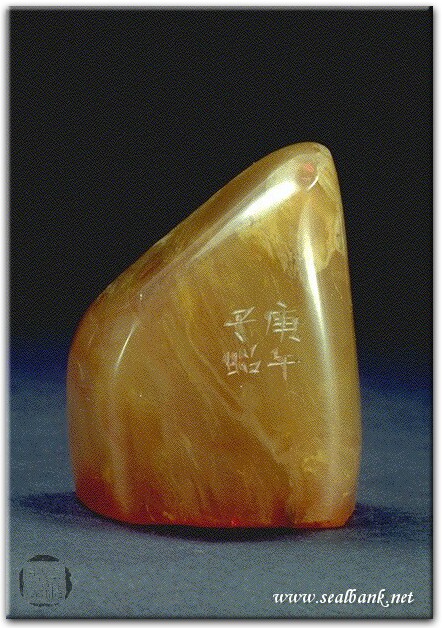 黃嘗銘.卅七歲/刻〔對酒當歌〕自然形朱文印。邊款為【庚午,子昭。】原印今藏於蕭世瓊。巴林凍。