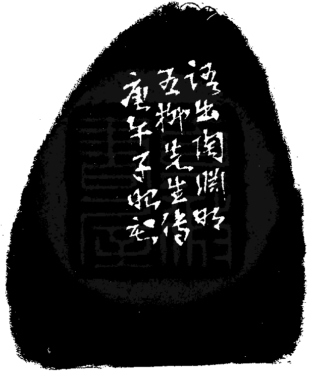黃嘗銘.卅七歲/刻〔每有會意便欣然忘食〕自然形朱文印。邊款為【語出陶淵明五柳先生傳,庚午,子昭刻。】原印今藏於江明賢。巴林石。