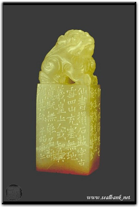 黃嘗銘.卅七歲/刻〔高古〕長方朱文無邊印。邊款為【即之不得,思之不至,寓目得心,旋取旋棄,繙金仙書,榻石鼓字,古雪四山,充塞無地,羲皇上人,或知其意,既無能名,誰洩其秘。子昭,庚午。】原印今藏於蕭俊卿。荔枝凍。