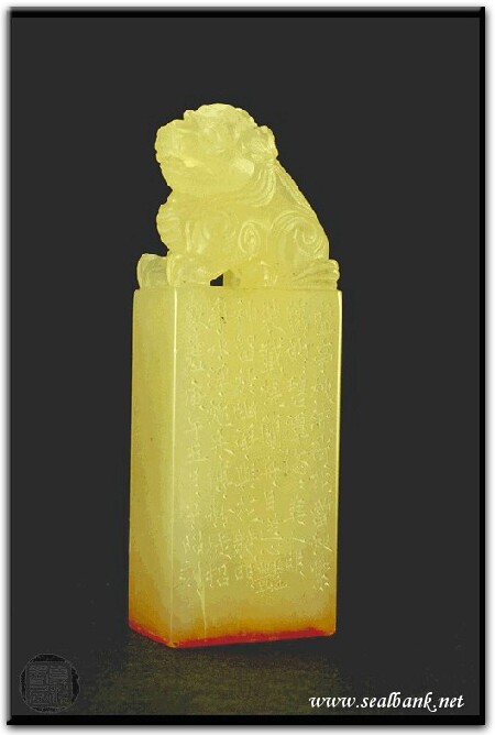 黃嘗銘.卅七歲/刻〔明淨〕長方朱文印。邊款為【虛亭枕流,荷花當秋,紫蘤的的,碧潭悠悠,美人明裝,載橈蘭舟,目送心豔,神留於幽,淨與花競,明爭水浮,施朱傅粉,徒招眾羞。庚午五月,子昭刻。】原印今藏於蕭俊卿。荔枝凍。