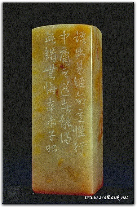黃嘗銘.卅八歲/刻〔中行無咎〕正方白文縱格印。邊款為【語出易經,命意惟行中庸之道者能得無錯無悔。辛未,子昭。】巴林凍。