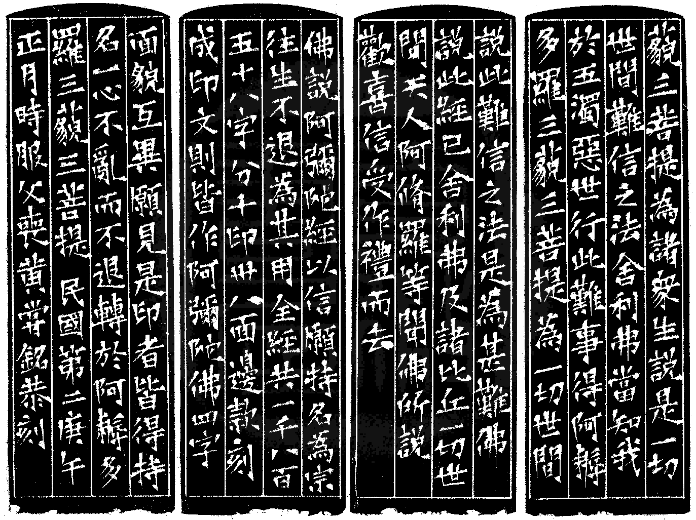 | | 印文:阿彌陀佛 | | 約 橫 2.7 X 豎 2.8 公分 印面圖 | | 黃嘗銘.卅七歲/刻〔阿彌陀佛〕正方白文縱格印。邊款為【藐三菩提。為諸眾生,說是一切世間難信之法。』」「舍利弗。當知我於五濁惡世,行此難事,得阿耨多羅三藐三菩提,為一切世間說此難信之法,是為甚難。」佛說此經已,舍利弗,及諸比丘,一切世間天人阿修羅等,聞佛所說,歡喜信受,作禮而去。