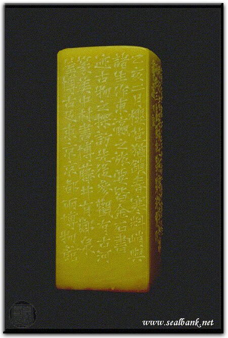 | | 印文:訪古探幽東瀛行 | | 約 橫 2.8 X 豎 2.8 公分 印面圖 邊款圖 | | 黃嘗銘.四十二歲/刻〔訪古探幽東瀛行〕正方朱文印。邊款為【乙亥二月,櫻苞猶鎖,春寒料峭,與諸生作東瀛之旅,要皆金石書跡之探訪,先後參觀有古河篆美、中村書博、藤井有鄰、泉屋博古及東京、京都兩博物館,也嘗於神保町書坊搜祕,流連多時,其間亦不忘尋幽訪勝,如京都銀閣南禪院、三十三間堂哲學道、奈良公園東大寺及箱根、日光等多處古蹟名勝,都曾逗留遊覽,而他如神戶世紀震災之見證,或原宿狂怪青春之體驗,亦都深刻難忘也。歸後刊石作記,得十八石,亦堪成集為譜矣。時已清明雨紛,子昭黃嘗銘於台北真微書屋。同行者,吳放之、柯詩安、李知融,而杜三鑫猶在學筑波,權作導遊,又記。】巴林凍。 1995 年刻 |