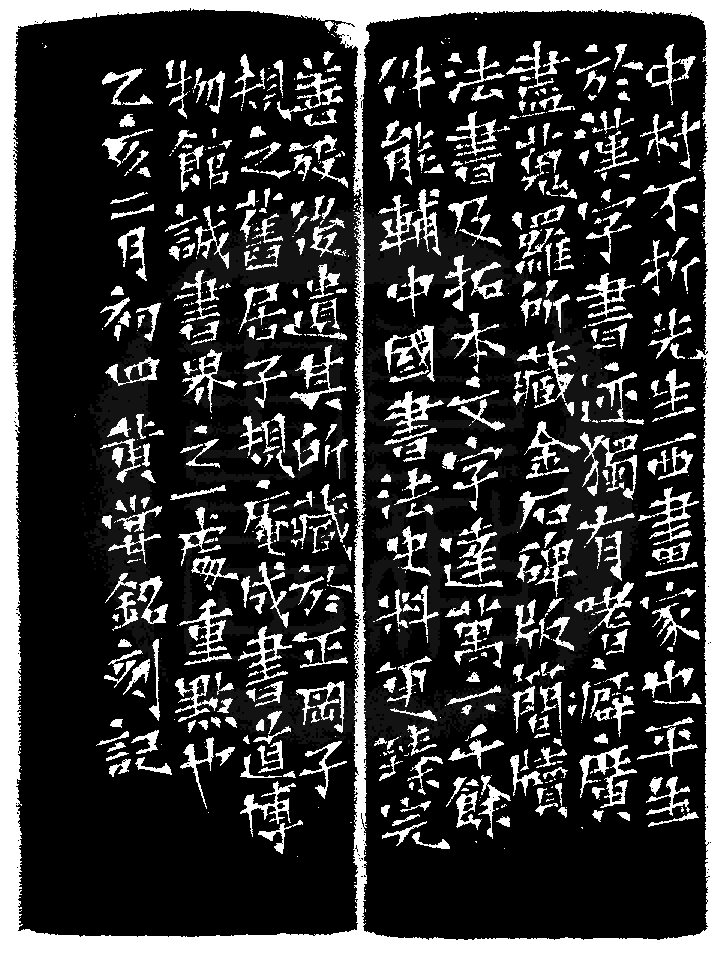 黃嘗銘.四十二歲/刻〔書道不折有真執〕正方白文印。邊款為【中村不折先生,西畫家也,平生於漢字書跡獨有嗜癖,廣盡蒐羅,所藏金石碑版、簡牘法書及拓本文字達萬六千餘件,能輔中國書法史料更臻完善。歿後遺其所藏於正岡子規之舊居《子規庵》成書道博物館,誠書界之一處重點也。乙亥二月初四,黃嘗銘刻記。】巴林凍。