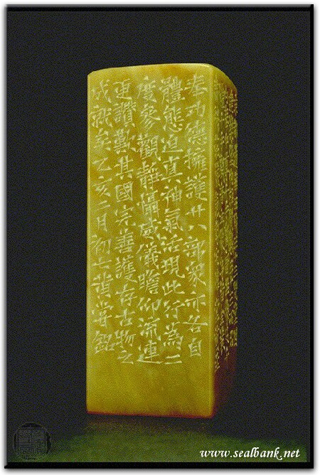 黃嘗銘.四十二歲/刻〔千一觀音廿八眾〕正方加框白文印。邊款為【京都蓮華王院三十三間堂,因建築堂內柱間數三十三而名,內奉中尊千手觀音坐像及千體千手觀音立像身,皆金裝肅穆莊嚴、氣勢宏偉,堂前並奉功德擁護廿八部眾,亦各自體態迫真、神氣活現,此行為二度參觀,靜攝威儀、瞻仰流連,更讚歎其國完善護存古物之成就矣。乙亥二月初七,黃嘗銘。】巴林凍。