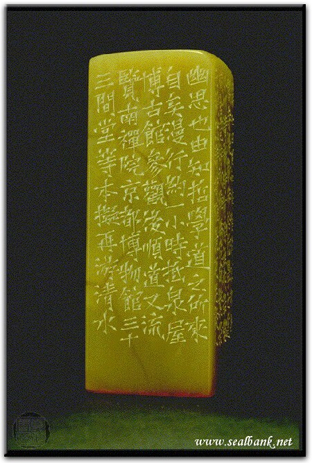 | | 印文:爽陰微行哲學道 | | 約 橫 2.8 X 豎 2.8 公分 印面圖 邊款圖 | | 黃嘗銘.四十二歲/刻〔爽陰微行哲學道〕正方朱文印。邊款為【第七日,風和爽陰,游京郣銀閣寺後,散步於哲學之道,小川清澈,時有游魚,夾岸櫻樹,含苞待放,雖無花盛繁榮之貌,然清境雅景更足發人幽思也,由知哲學道之所來自矣。漫行約一小時,抵泉屋博古館,參觀後順道又流覽南禪院、京都博物館、三十三間堂等,本擬再游清水寺,而天色近晚,且諸生已帶倦容,只好作罷歸去。乙亥二月初七、黃嘗銘刻記。】巴林凍。 1995 年刻 |
