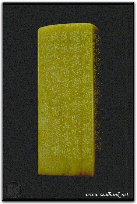 | | 印文:青春狂怪原宿族 | | 約 橫 2.8 X 豎 2.8 公分 印面圖 邊款圖 | | 黃嘗銘.四十二歲/刻〔青春狂怪原宿族〕正方朱文借邊印。邊款為【原宿明治神宮前之代代木公園,夙為青春園地,每逢周末,道路封閉,兩側各為樂團、舞群所據,兀自奇裝怪服,標新立異,或鼓聲震聾,或嘶吼欲啞,或扭舞盤旋,或飛輪跳躍,極盡狂野之樂;間亦有隻身單客演者,或扮江戶藝妓,或作吸血彊屍,或獨奏清唱,或悠游穿梭,千奇百樣,五色目盲,著實令人身受東瀛青春之狂怪也。民國第二乙亥二月十二,黃嘗銘。】巴林凍。 1995 年刻 |