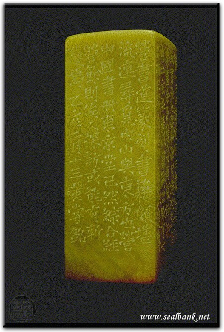 黃嘗銘.四十二歲/刻〔神保再顧搜奇祕〕正方朱文印。邊款為【第十三日,詩安陪三鑫回筑波取書,放之與知融同遊迪斯奈樂園,余則隻身再顧神保町,二玄社素以書跡出版有大名而只闢有小門市,飯島專營書道篆刻書籍,頗堪流連尋覓,內山與東方也營中國書冊,東京堂已然綜合經營,餘則俟人探訪或能有斬獲焉。乙亥二月十三,黃嘗銘。】巴林凍。