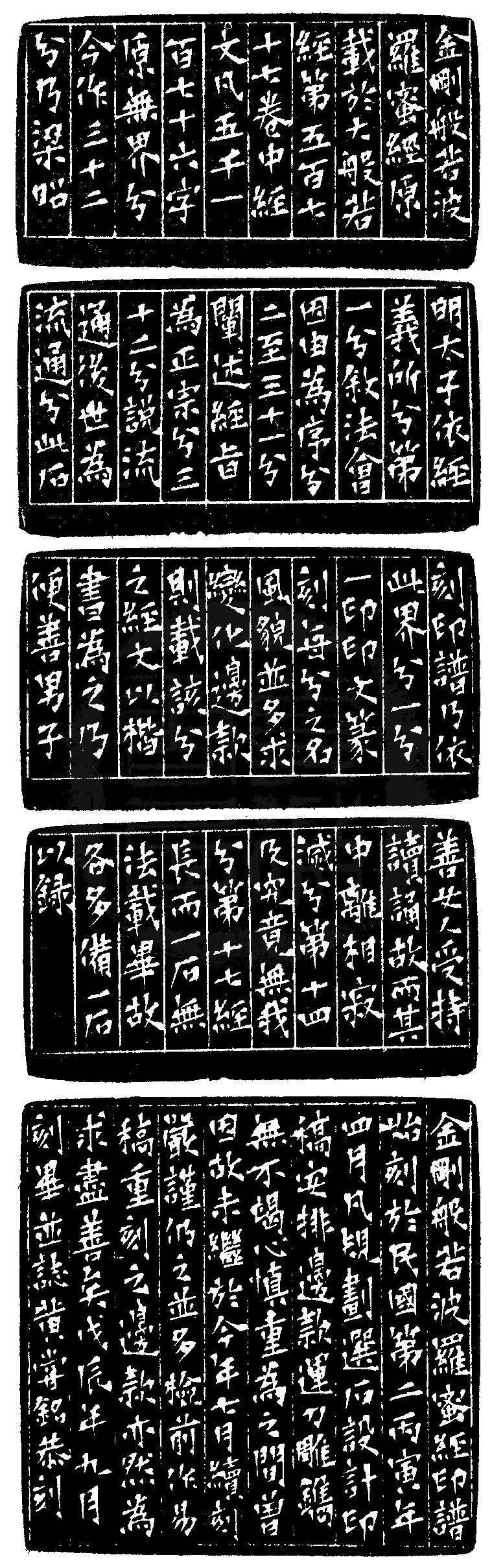 | | 印文:金剛般若波羅蜜經 | | 約 橫 5.9 X 豎 5.9 公分 印面圖 | | 黃嘗銘.卅五歲/刻〔金剛般若波羅蜜經〕正方朱文寬細邊印。邊款為【金剛般若波羅蜜經原載於大般若經第五百五十七卷中,經文凡五千一百七十六字,原無界分,今作三十二分,乃梁昭明太子依經義所分,第一分敘法會因由為序分,二至三十一分闡述經旨為正宗分,第三十二分說流通後世為流通分。此石刻印譜乃依此界分,一分一印,印文篆刻每分之名,風貌並多求變化,邊款則載該分之經文,以楷書為之,乃便善男子、善女人受持讀誦故,而其中離相寂滅分第十四及究竟無我分第十七,經長而一石無法載畢,故各多備一石以錄。金剛般若波羅蜜經始刻於民國第二丙寅年四月,凡規劃選石、設計印稿、安排邊款、運刀雕鐫,無不竭心慎重為之,間曾因故未繼,於今年七月續刻,嚴謹仍之,並多檢前作易稿重刻之,邊款亦然,為求盡善矣。戊辰年九月刻畢並誌,黃嘗銘恭刻。】原印今藏於陳川林。泰來石。 1988 年刻 |