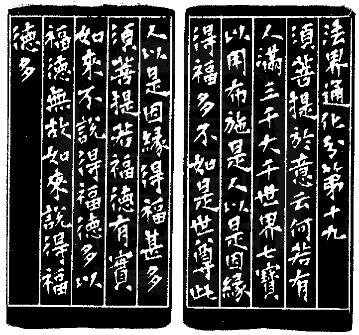 黃嘗銘.卅五歲/刻〔法界通化〕正方朱文印。邊款為【法界通化分第十九。「須菩提!於意云何?若有人滿三千大千世界七寶,以用布施,是人以是因緣,得福多不?」「如是,世尊!此人以是因緣,得福甚多。」「須菩提!若福得有實,如來不說得福德多,以福德無故,如來說得福德多。」】原印今藏於陳川林。泰來石。