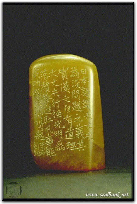 黃嘗銘.卅九歲/刻〔大丈夫〕自然形朱文印。邊款為【日本語謂大丈夫為沒問題之義,其實漢文自有道理,大丈夫行徑光明磊落,積極進取,凡事能成功,當然沒問題。子昭刻記。】巴林凍。