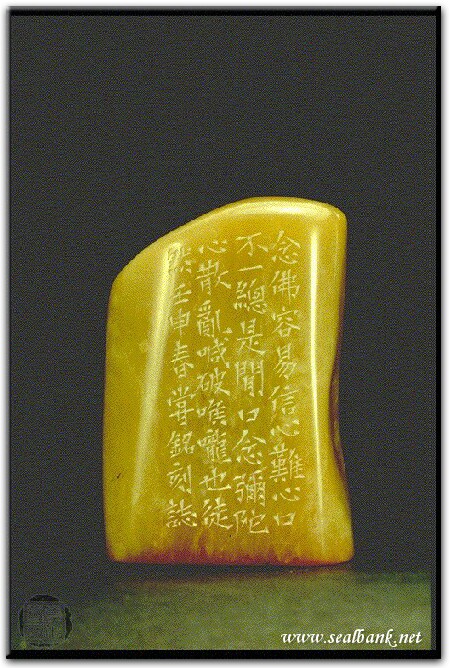 黃嘗銘.卅九歲/刻〔老實唸佛〕自然形朱文印。邊款為【念佛容易信心難,心口不一總是閒,口念彌陀心散亂,喊破喉嚨也徒然。壬申春,嘗銘刻誌。】巴林凍。