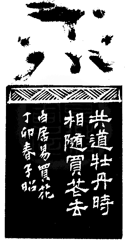 黃嘗銘.卅四歲/刻〔共道牡丹時相隨買花去〕正方白文印。邊款為【共道牡丹時,相隨買花去。白居易買花。丁卯春,子昭。】巴林石。