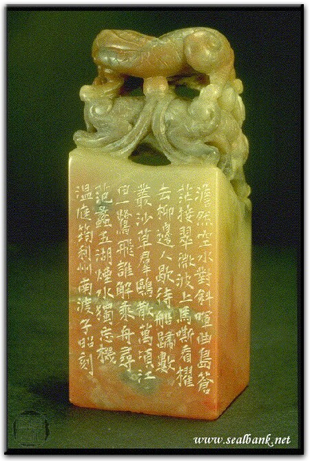 黃嘗銘.卅四歲/刻〔五湖煙水獨忘機〕正方朱文印。邊款為【澹然空水對斜暉,曲島蒼茫接翠微,波上馬嘶看櫂去,柳邊人歇待船歸。數叢沙草群鷗散,萬頃江田一鷺飛,誰解乘舟尋范蠡,五湖煙水獨忘機。溫庭筠利州南渡。子昭刻。】巴林石。