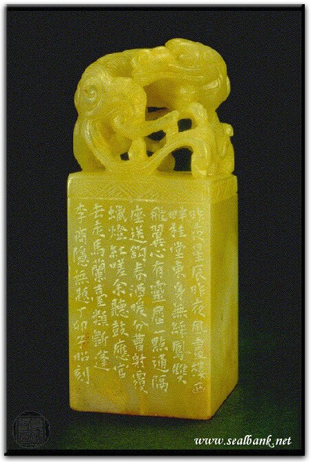 黃嘗銘.卅四歲/刻〔心有靈犀一點通〕正方加框白文印。邊款為【昨夜星辰昨夜風,畫樓西畔桂堂東,身無綵鳳雙飛翼,心有靈犀一點通。隔座送鉤春酒暖,分曹射覆蠟燈紅,嗟余聽鼓應官去,走馬蘭臺類斷蓬。李商隱無題。丁卯,子昭刻。】巴林石。