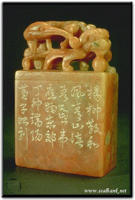 黃嘗銘.卅四歲/刻〔楊柳散和風青山澹吾慮〕長方細朱文印。邊款為【楊柳散和風,青山淡吾慮。韋應物東郊。丁卯端陽,黃子昭刻。】巴林石。