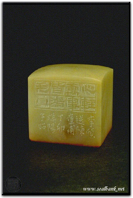 黃嘗銘.卅四歲/刻〔心輕萬事皆鴻毛〕正方朱文印。邊款為【心輕萬事皆鴻毛。李頎送陳章甫。丁卯端陽,子昭。】巴林石。