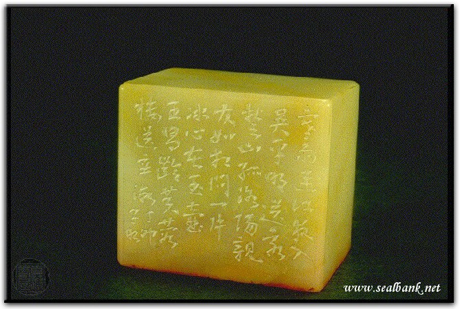 黃嘗銘.卅四歲/刻〔一片冰心在玉壼〕長方朱文印。邊款為【寒雨連江夜入吳,平明送客楚山孤,洛陽親友如相問,一片冰心在玉壼。王昌齡芙蓉樓送辛漸。丁卯,子昭。】巴林石。