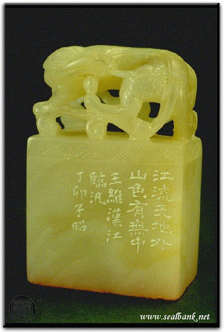 黃嘗銘.卅四歲/刻〔山色有無中〕長方白文印。邊款為【江流天地外,山色有無中。王維漢江臨汎。丁卯,子昭。】巴林石。