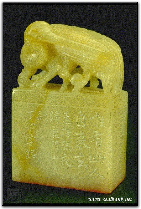 黃嘗銘.卅四歲/刻〔唯有幽人自來去〕長方朱文印。邊款為【唯有幽人自來去。孟浩然夜歸鹿門山歌。丁卯,嘗銘。】巴林石。