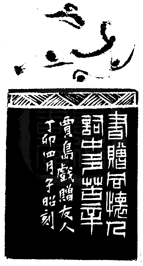 黃嘗銘.卅四歲/刻〔書贈同懷人〕長方加框白文印。邊款為【書贈同懷人,詞中多苦辛。買島戲贈友人。丁卯四月,子昭刻。】巴林石。