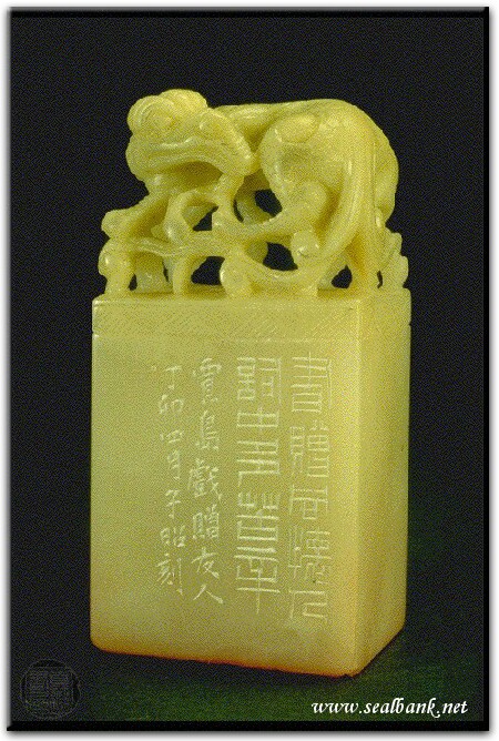 黃嘗銘.卅四歲/刻〔書贈同懷人〕長方加框白文印。邊款為【書贈同懷人,詞中多苦辛。買島戲贈友人。丁卯四月,子昭刻。】巴林石。