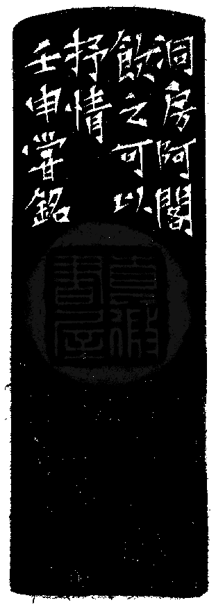 黃嘗銘.卅九歲/刻〔洞房阿閣〕正方白文印。邊款為【洞房阿閣,飲之可以抒情。壬申,嘗銘。】原印今藏於陳川林。巴林凍。