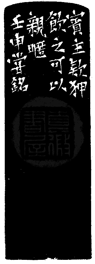 黃嘗銘.卅九歲/刻〔賓主款狎〕正方朱文印。邊款為【賓主款狎,飲之可以親暱。壬申,嘗銘。】原印今藏於陳川林。巴林凍。
