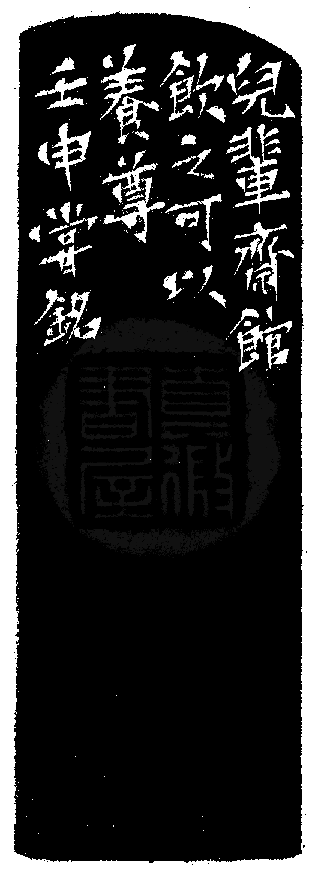 黃嘗銘.卅九歲/刻〔兒輩齋館〕正方朱文印。邊款為【兒輩齋館,飲之可以養尊。壬申,嘗銘。】原印今藏於陳川林。巴林凍。