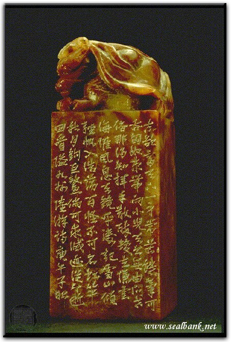 黃嘗銘.卅七歲/刻〔揮手散醉髮去隱雲海涯〕正方細朱文印。邊款為【志欲富天下,一身常苦饑。氣可吞匈奴,束帶向小兒。天公無由問,世俗那得知!揮手散醉髮,去隱雲海涯。風息天鏡平,濤起雪山傾。輕帆入浩蕩,百怪不可名。虹竿秋月鉤,巨鰲倘可求。滅跡從今逝,回看隘九州。陸游詩。庚午,子昭。】壽山高山。