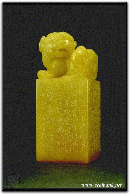黃嘗銘.卅七歲/刻〔春風十里柔情〕正方朱文印。邊款為【倚危亭、恨如芳草,萋萋剷盡還生。念柳外青驄別後,水邊紅袂分時,愴然暗驚。無端天與娉婷,夜月一簾幽夢,春風十里柔情。怎奈向歡娛,漸隨流水、素絃聲斷,翠綃香減。那堪片片飛花弄晚,濛濛殘雨籠晴。正銷凝,黃鸝又啼數聲。秦觀八六子詞。庚午五月,黃嘗銘刻。】壽山白高山。