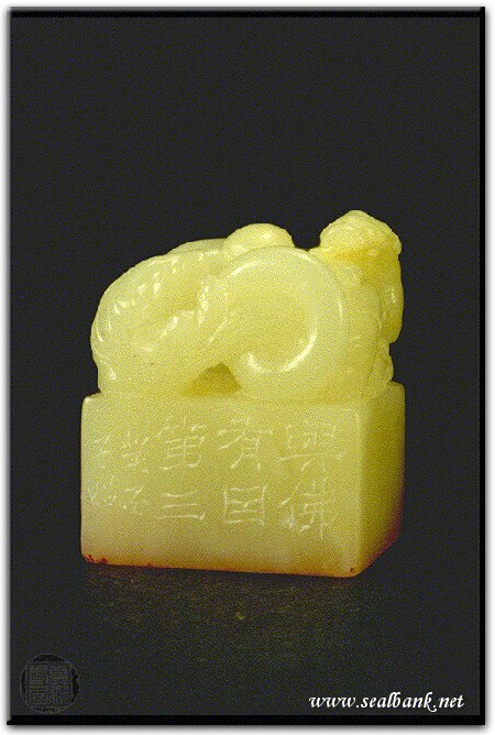 黃嘗銘.四十歲/刻〔與佛有因〕正方朱文借邊印。邊款為【與佛有因第三。癸酉,子昭。】芙蓉石。