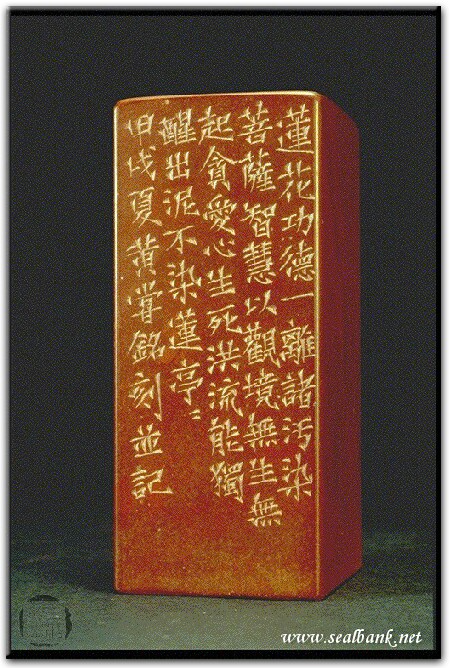 黃嘗銘.四十一歲/刻〔離諸污染〕正方朱文借邊印。邊款為【蓮花功德一,離諸污染。菩薩智慧以觀境,無生無起貪愛心,生死洪流能獨醒,出泥不染蓮亭亭。甲戌夏,黃嘗銘刻並記。】蕭山石。