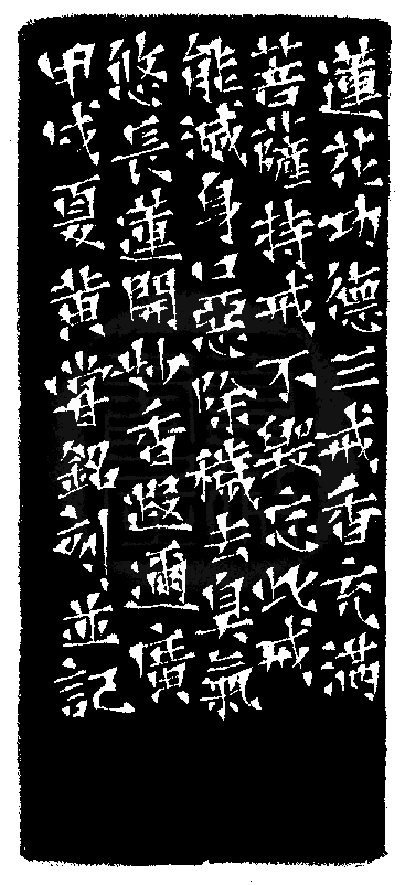 黃嘗銘.四十一歲/刻〔戒香充滿〕正方白文印。邊款為【蓮花功德三,戒香充滿。菩薩持戒不毀忘,此戒能滅身口惡,除穢去臭氣悠長,蓮開妙香遐邇廣。甲戌夏,黃嘗銘刻並記。】蕭山石。