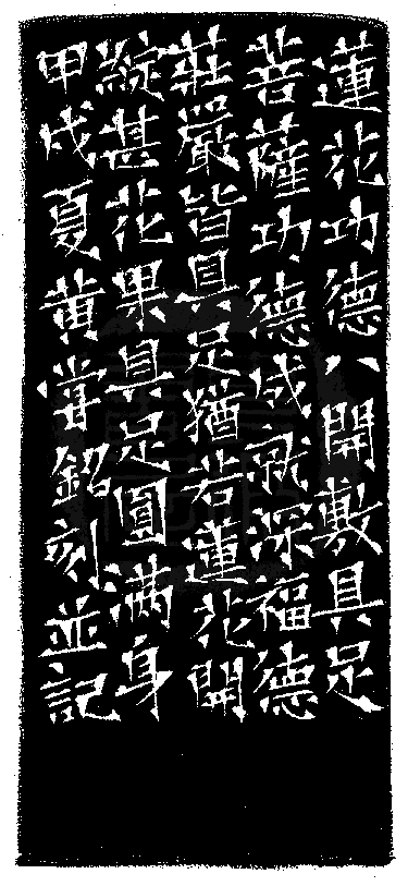 黃嘗銘.四十一歲/刻〔開敷具足〕正方朱文界格印。邊款為【蓮花功德八,開敷具足。菩薩功德成就深,福德莊嚴皆具足,猶若蓮花開綻甚,花果具足圓滿身。甲戌夏,黃嘗銘刻並記。】蕭山石。